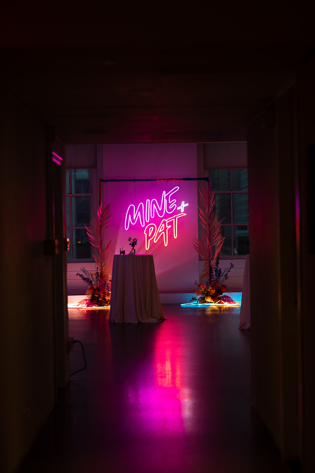 The bride wanted a fun specialized focal point for her wedding. A bright neon light sign with the couple’s name provided a fun energized backdrop for the dance floor and a perfect Instagram moment.